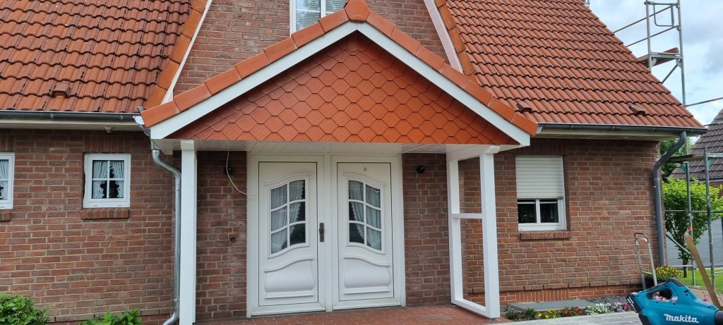 Unser Service für Eingangsüberdachungen bietet Ihnen stilvolle und funktionale Überdachungen, die Ihren Eingangsbereich vor Witterungseinflüssen schützen. Wir fertigen individuell gestaltete Überdachungen aus hochwertigem Holz, die perfekt zu Ihrem Gebäude passen. Unsere erfahrenen Zimmerer sorgen für präzise Handwerkskunst und eine fachgerechte Montage. Vertrauen Sie auf unsere Expertise, um Ihrem Eingangsbereich eine attraktive und praktische Lösung zu verleihen, die sowohl Schutz als auch ästhetischen Mehrwert bietet.